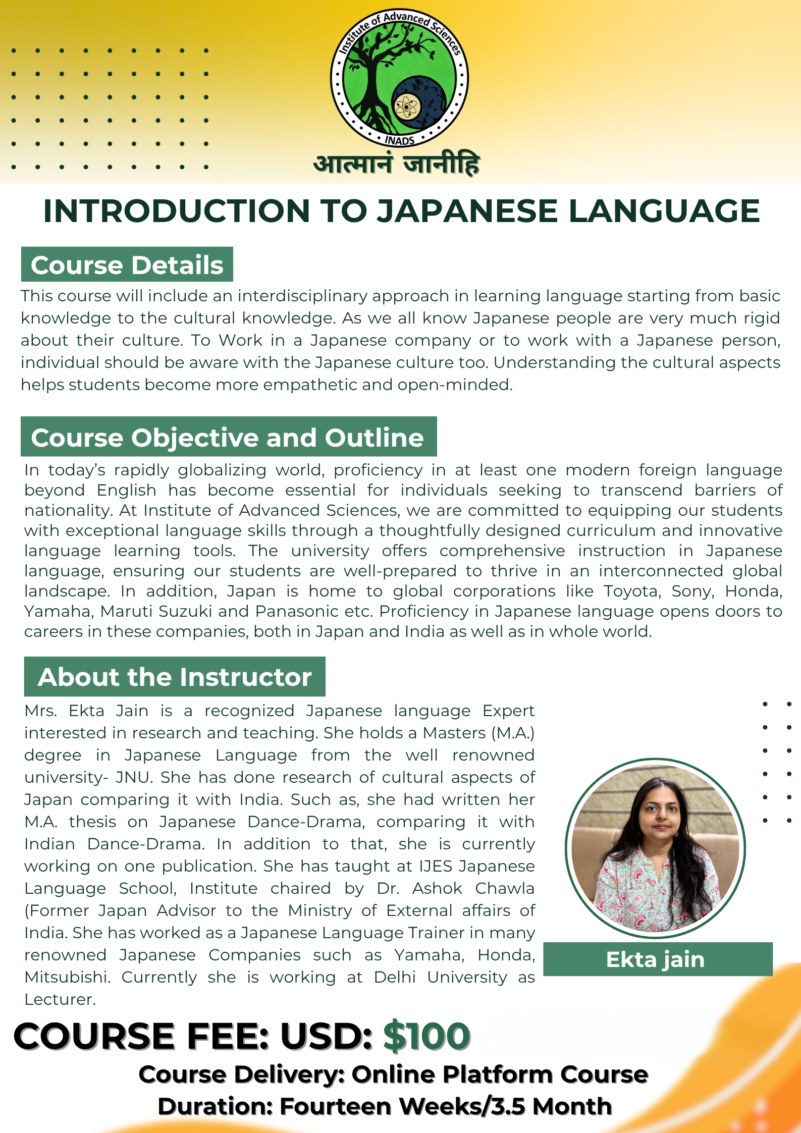 In today’s rapidly globalizing world, proficiency in at least one modern foreign language beyond English has become essential for individuals seeking to transcend barriers of nationality. At Institute of Advanced Sciences, we are committed to equipping our students with exceptional language skills through a thoughtfully designed curriculum and innovative language learning tools. The university offers comprehensive instruction in Japanese language, ensuring our students are well-prepared to thrive in an interconnected global landscape. In addition, Japan is home to global corporations like Toyota, Sony, Honda, Yamaha, Maruti Suzuki and Panasonic etc. Proficiency in Japanese language opens doors to careers in these companies, both in Japan and India as well as in whole world.